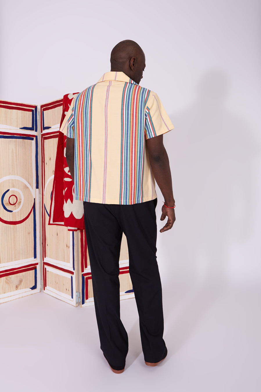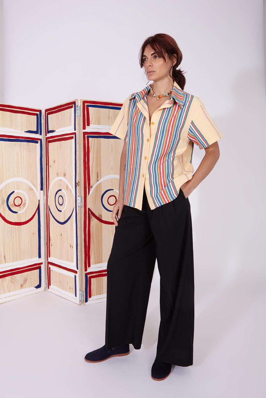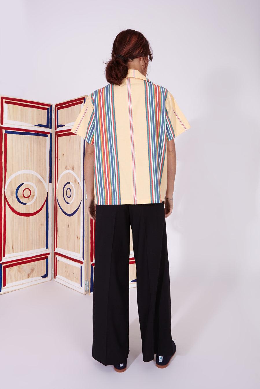 Born from a serendipitous find at a French flea market, this garment is a tribute to the effortless elegance of the 1950s. A simple cotton tablecloth is transformed into a piece that captures the essence of an era, with its signature multicolored stripes strategically placed at the center of the shirt.