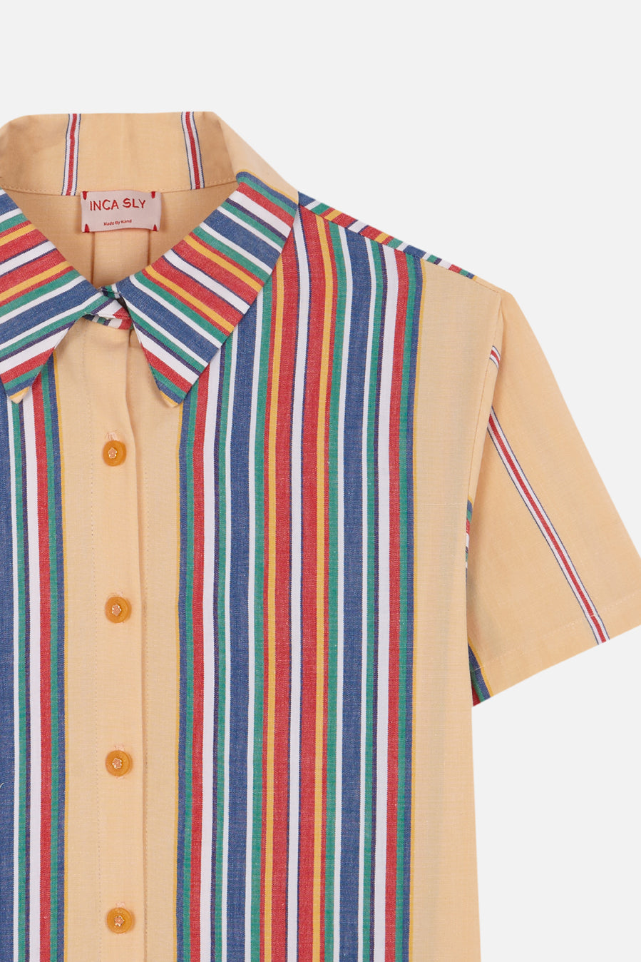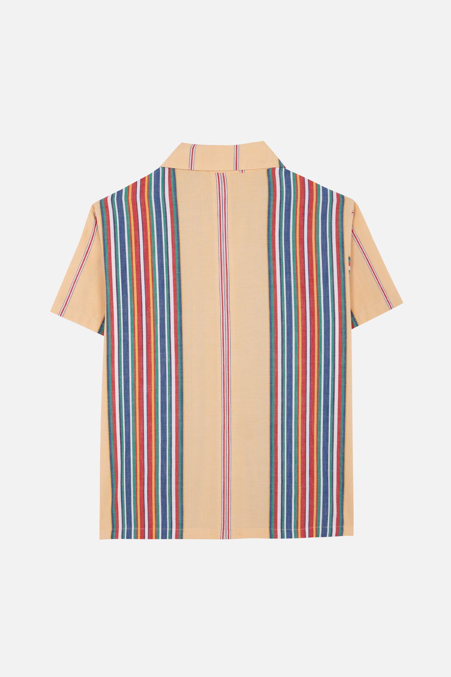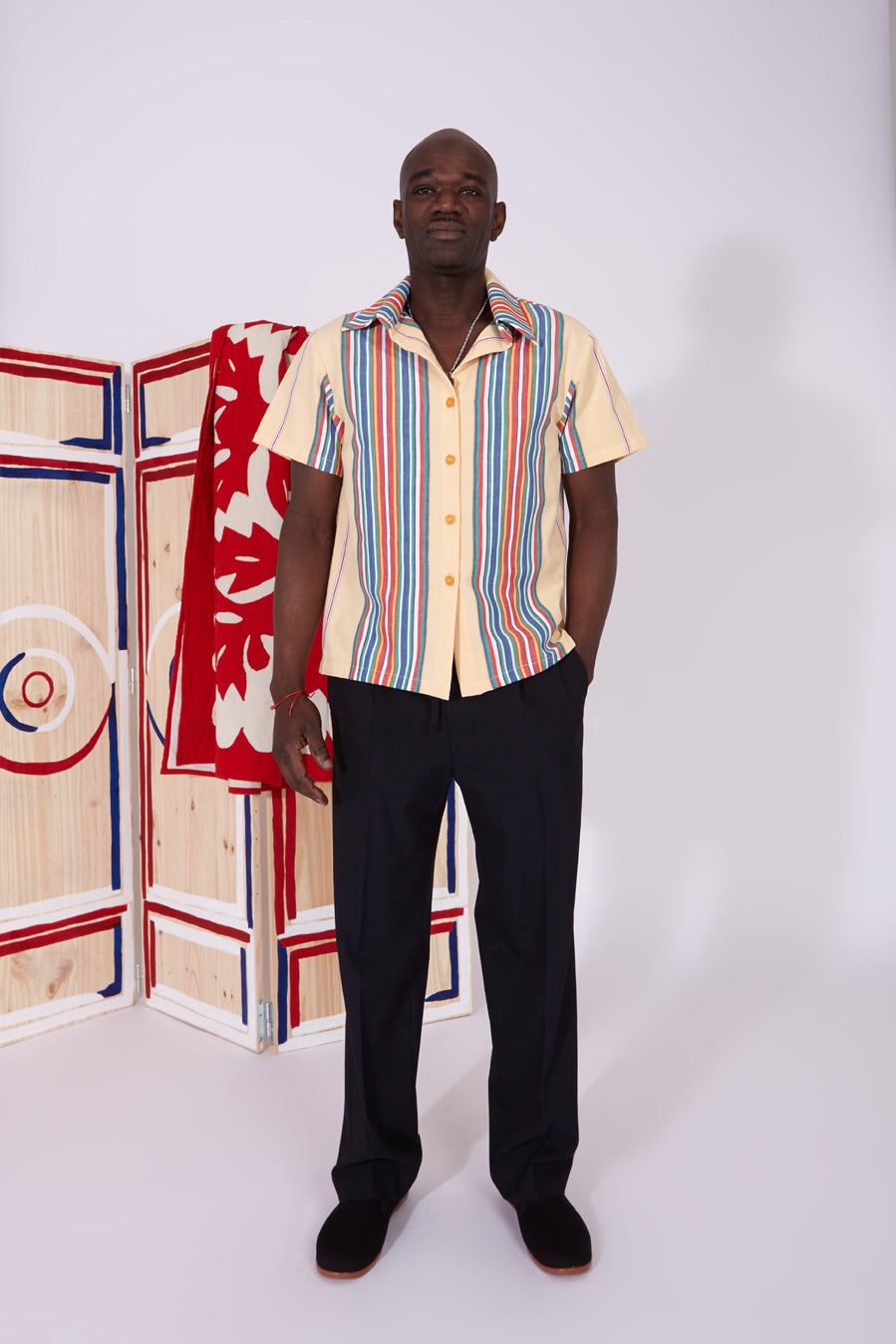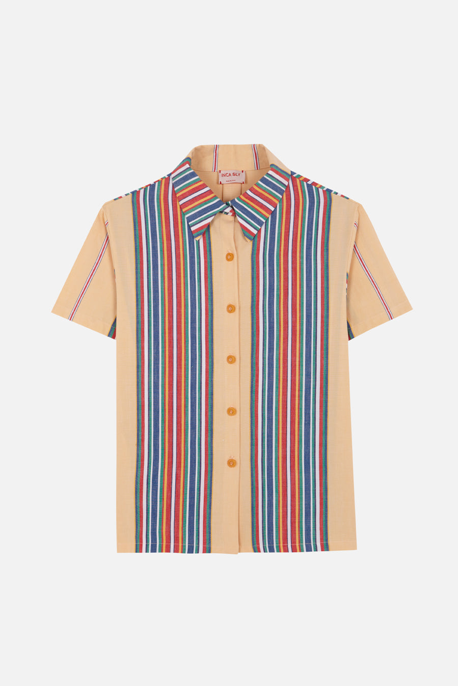Born from a serendipitous find at a French flea market, this garment is a tribute to the effortless elegance of the 1950s. A simple cotton tablecloth is transformed into a piece that captures the essence of an era, with its signature multicolored stripes strategically placed at the center of the shirt.